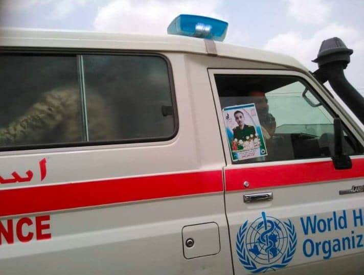 وذكر الشهود أنهم شاهدوا إحدى سيارات الإسعاف التابعة لمنظمة الصحة العالمية وعليها ملصق لأحد قتلى ميلشيا الحوثي الانقلابية”.