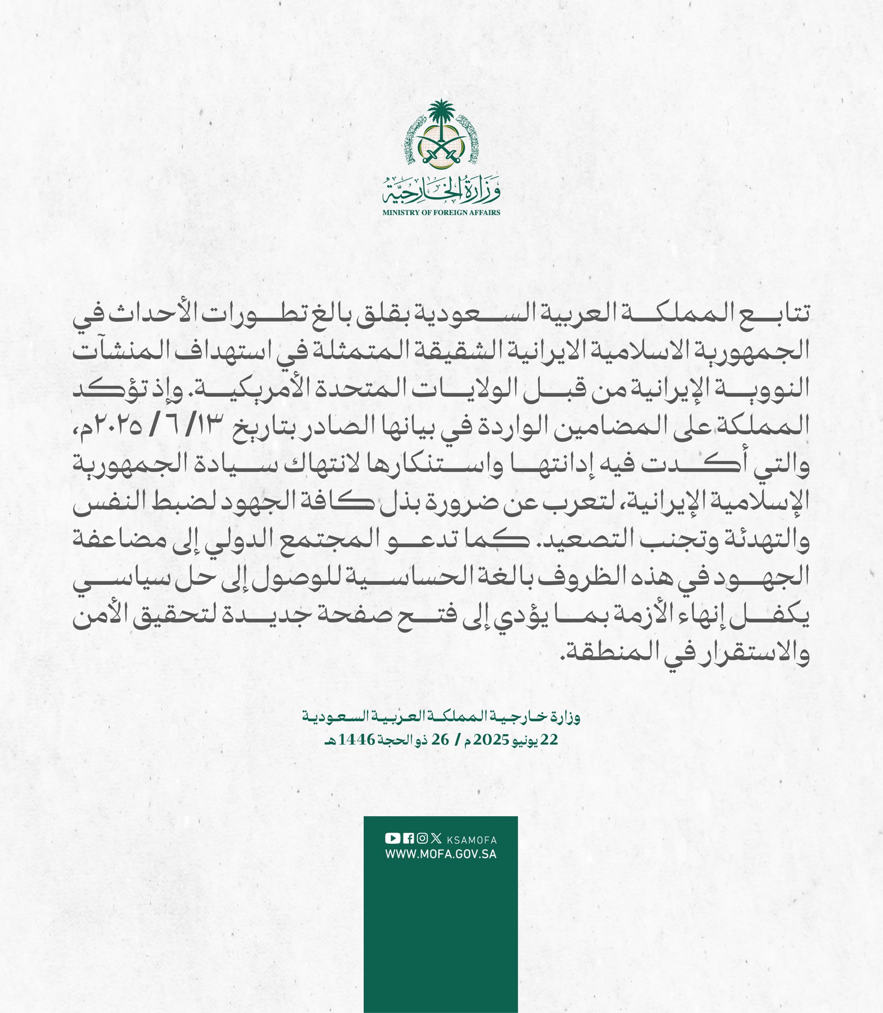 واتهم البيان الولايات المتحدة بـ”تحمّل المسؤولية الكاملة عن الهجوم”، مؤكدًا أن الضربات تمت عبر “طائرات شبحية متقدمة”، فيما حمّلت طهران الوكالة الدولية للطاقة الذرية جزءًا من المسؤولية، ووصفت موقفها بـ”اللامبالي والمتواطئ”.