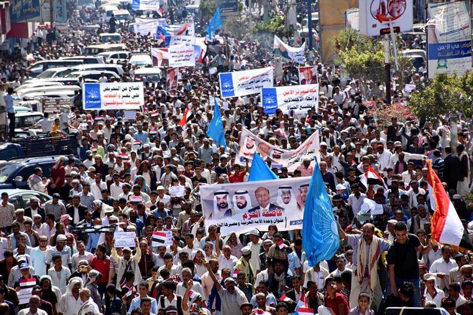 وهتف المشاركون في ذكرى انطلاق عاصفة الحزم وانطلاق المقاومة ضد مليشيا الحوثي الكهنوتية في تعز، حيث هتف المشاركون دعماً لفرض هيبة الدولة وإنهاء الاختلالات الأمنية.