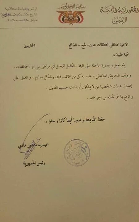وجه الرئيس عبدربه منصور هادي رئيس الجمهورية محافظة عدن ولحج والضالع بإيقاف ترحيل المواطنين من تلك المحافظات الثلاث ومحاسبة من يمارسون تلك الاعمال بشكل صارم ...